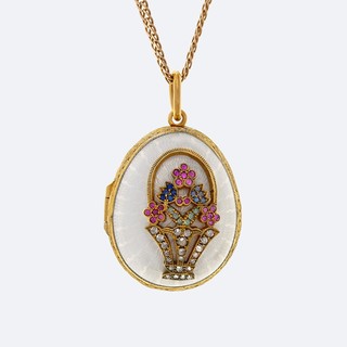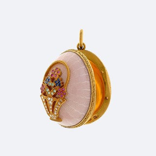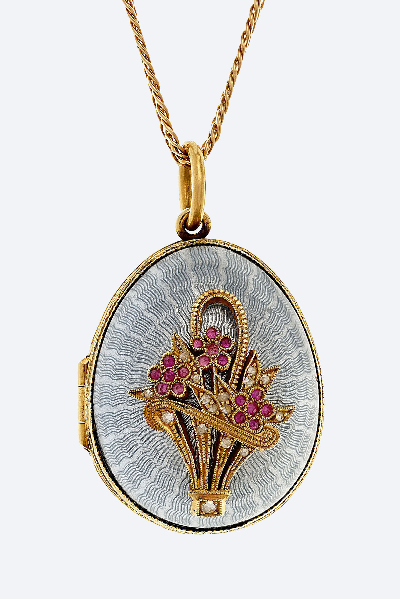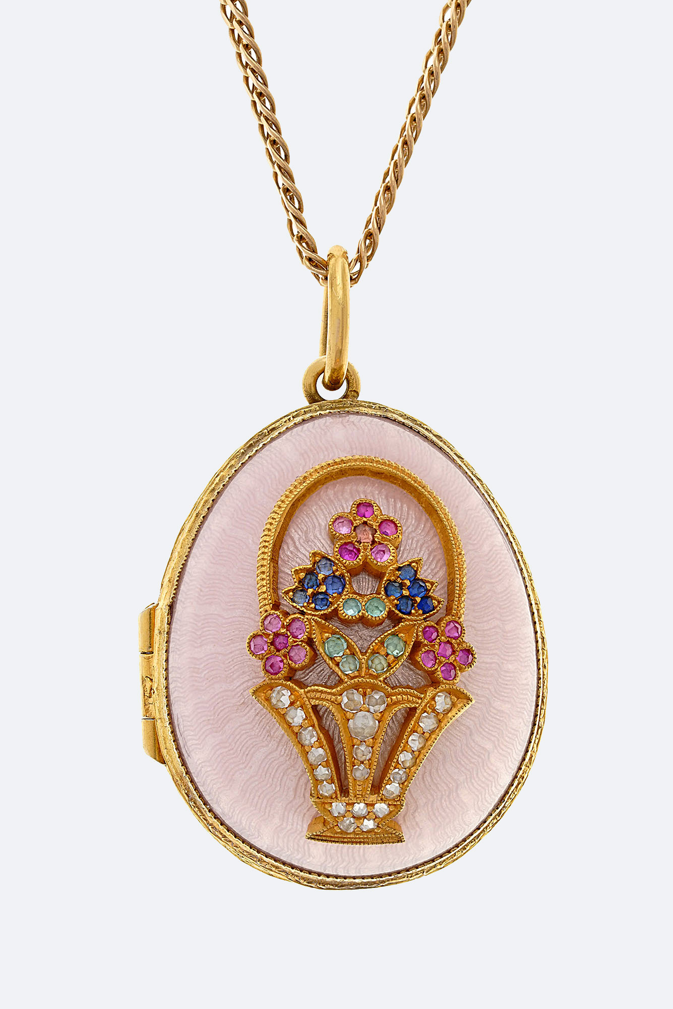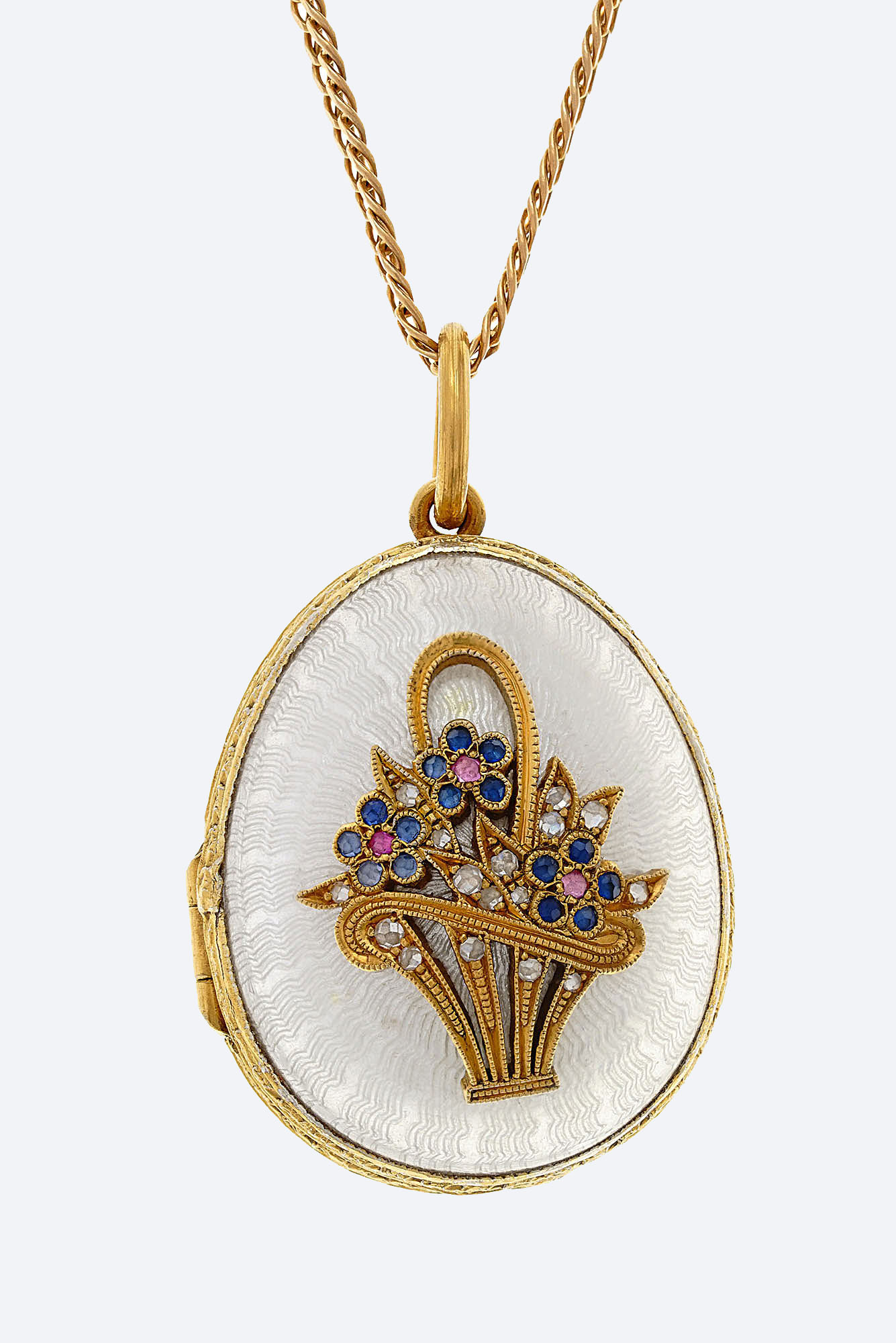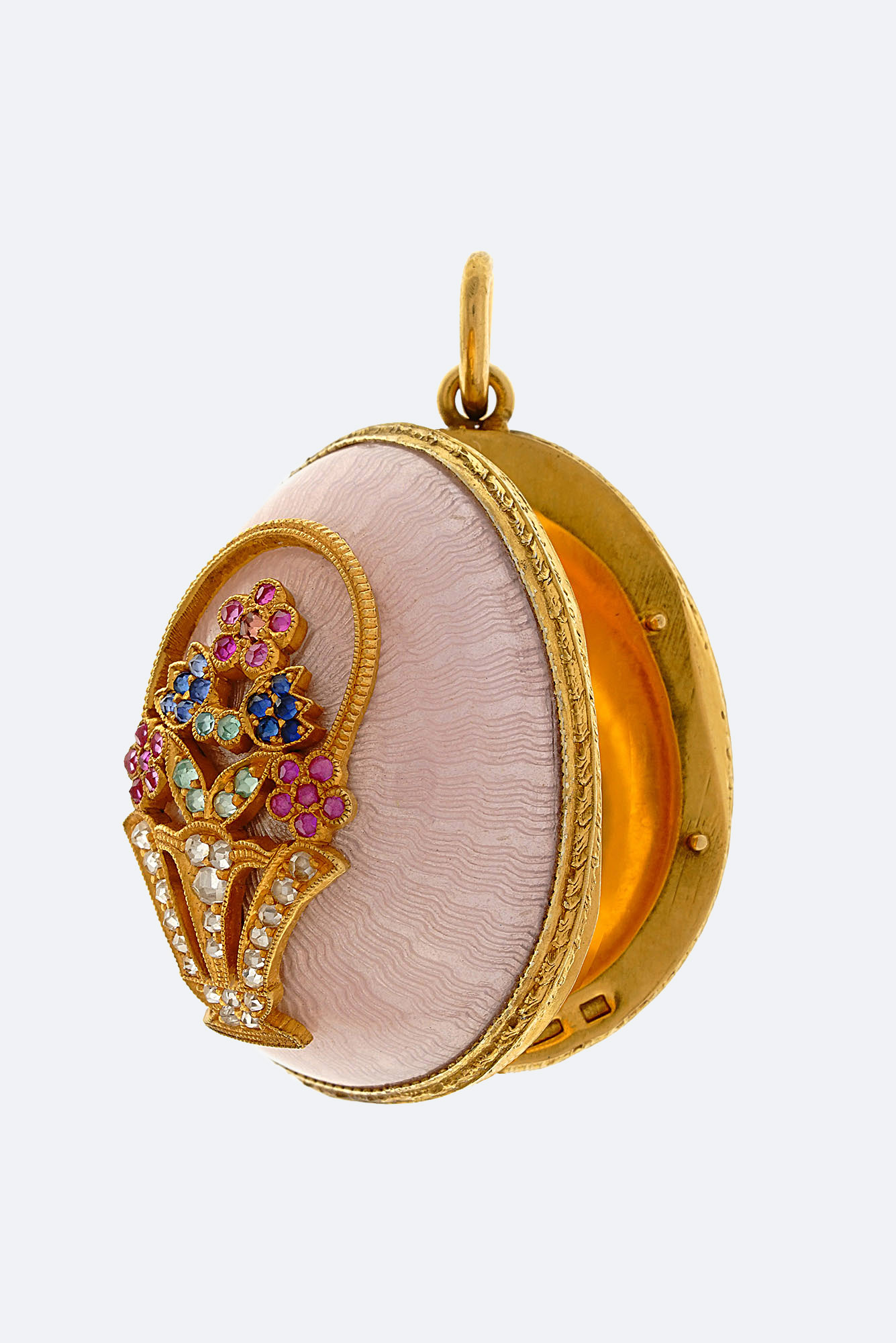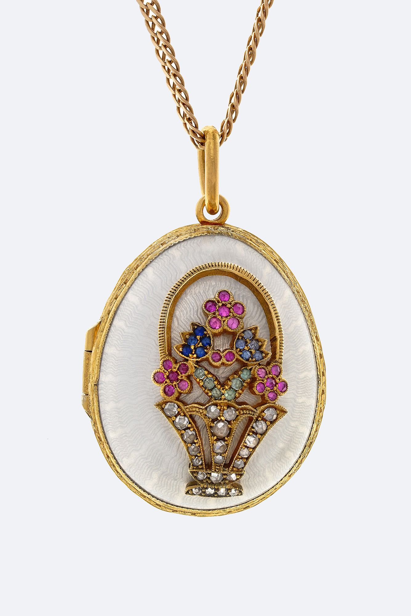 Золото 585, серебро 925, позолота, цветные корунды, розы, прозрачная эмаль по гильошированному фону.