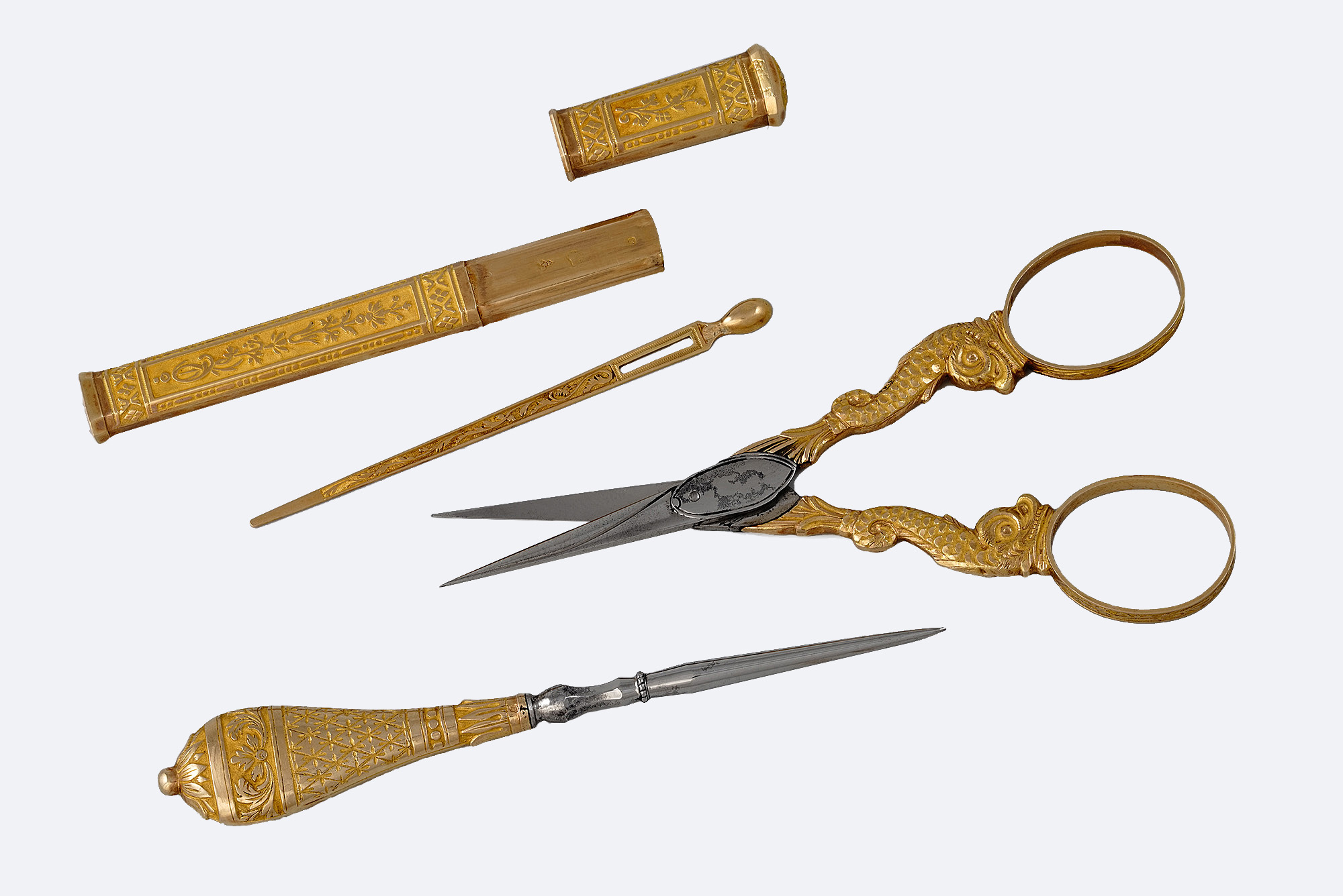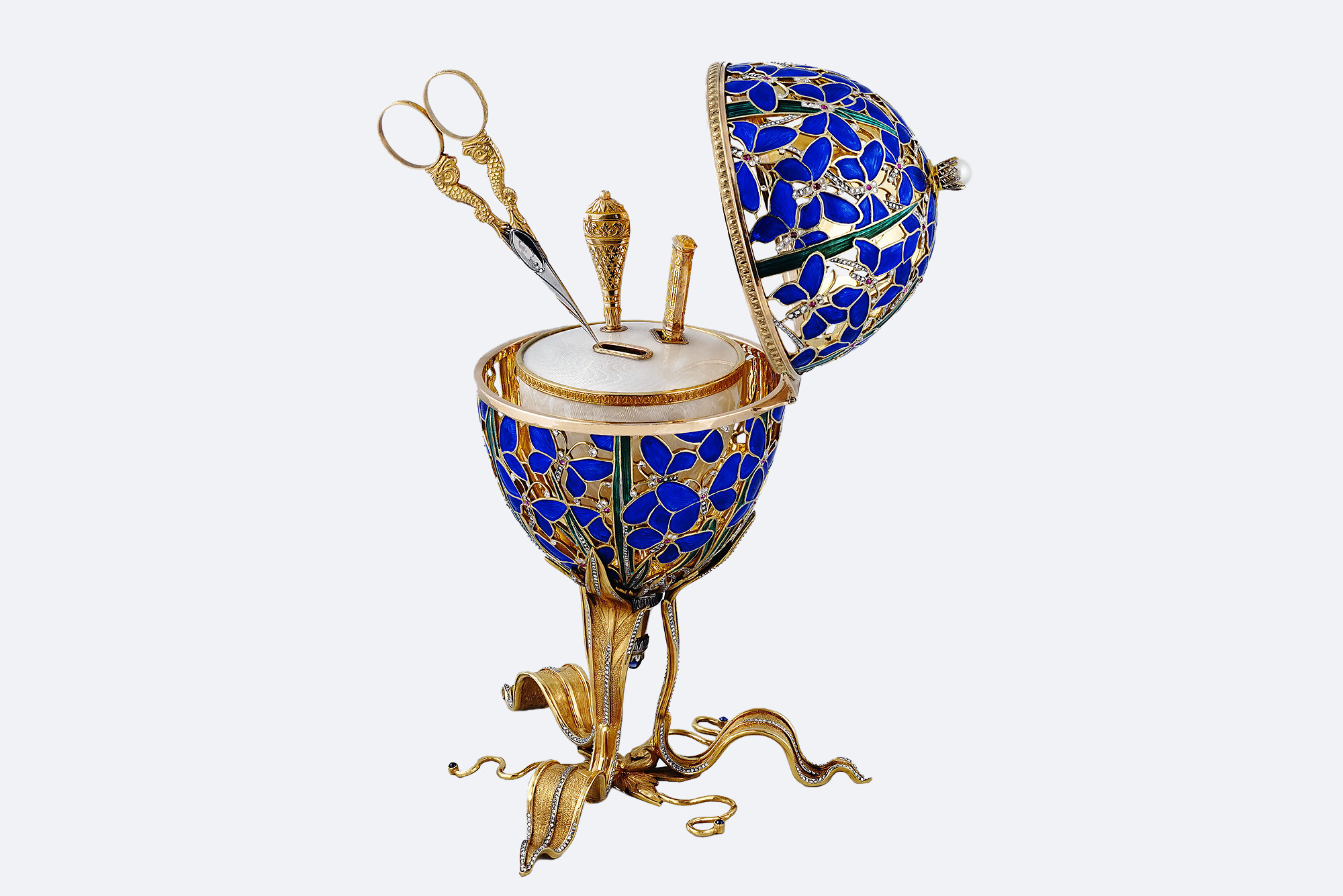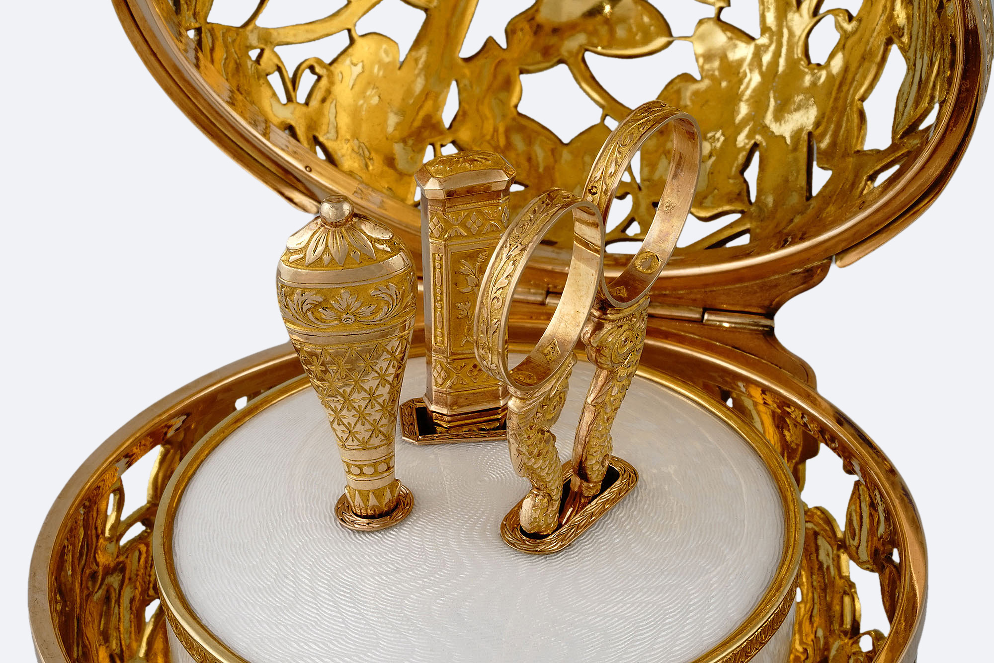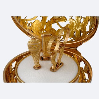 Золото, серебро, позолота, бриллианты, белые сапфиры, жемчуг, сталь, глубокая гравировка, прозрачная эмаль.
