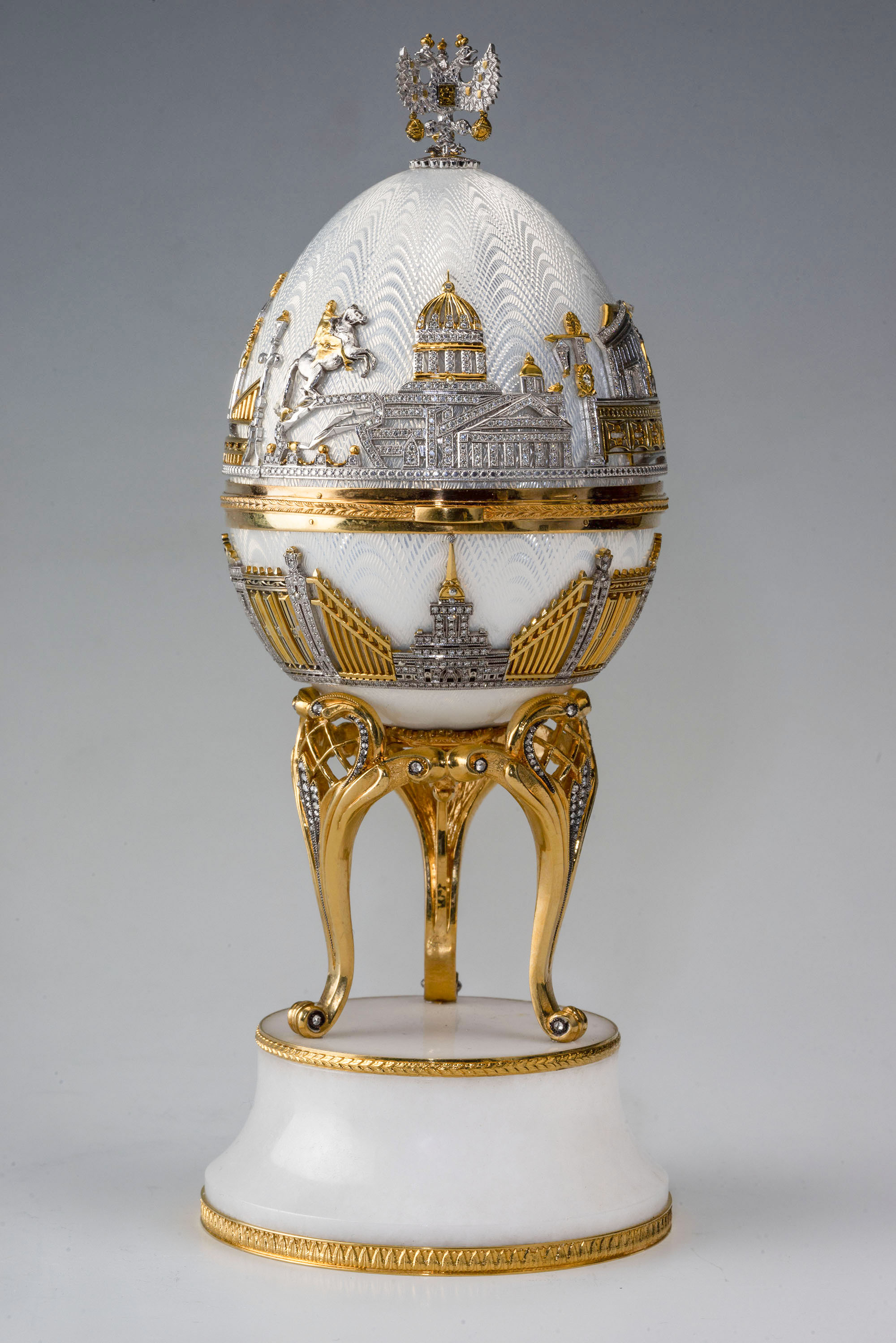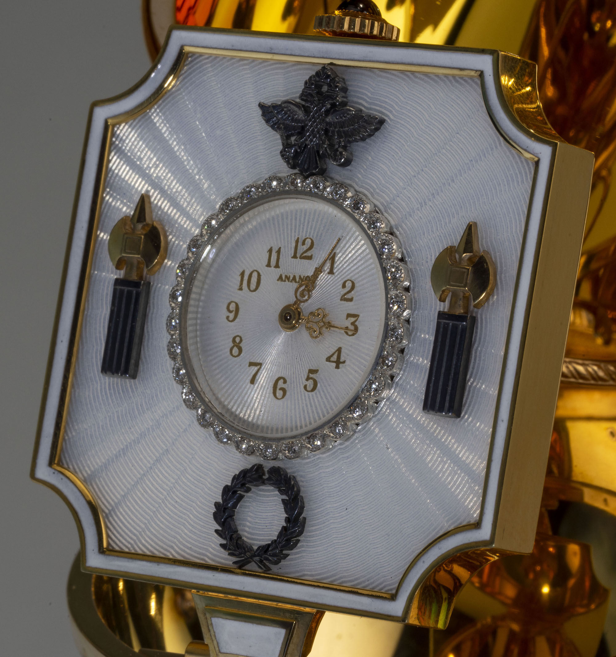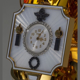 Золото, серебро, позолота, бриллианты, прозрачная эмаль по гильошированному фону, сапфиры, розы, белый мрамор