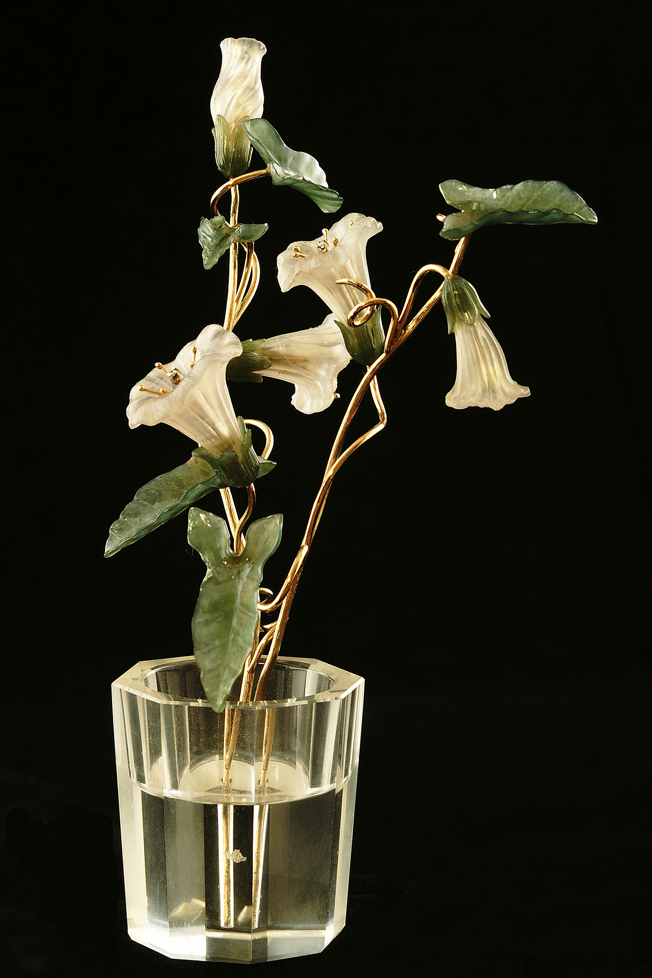 Золото, серебро, позолота, бриллианты, нефрит, кахолонг, горный хрусталь.