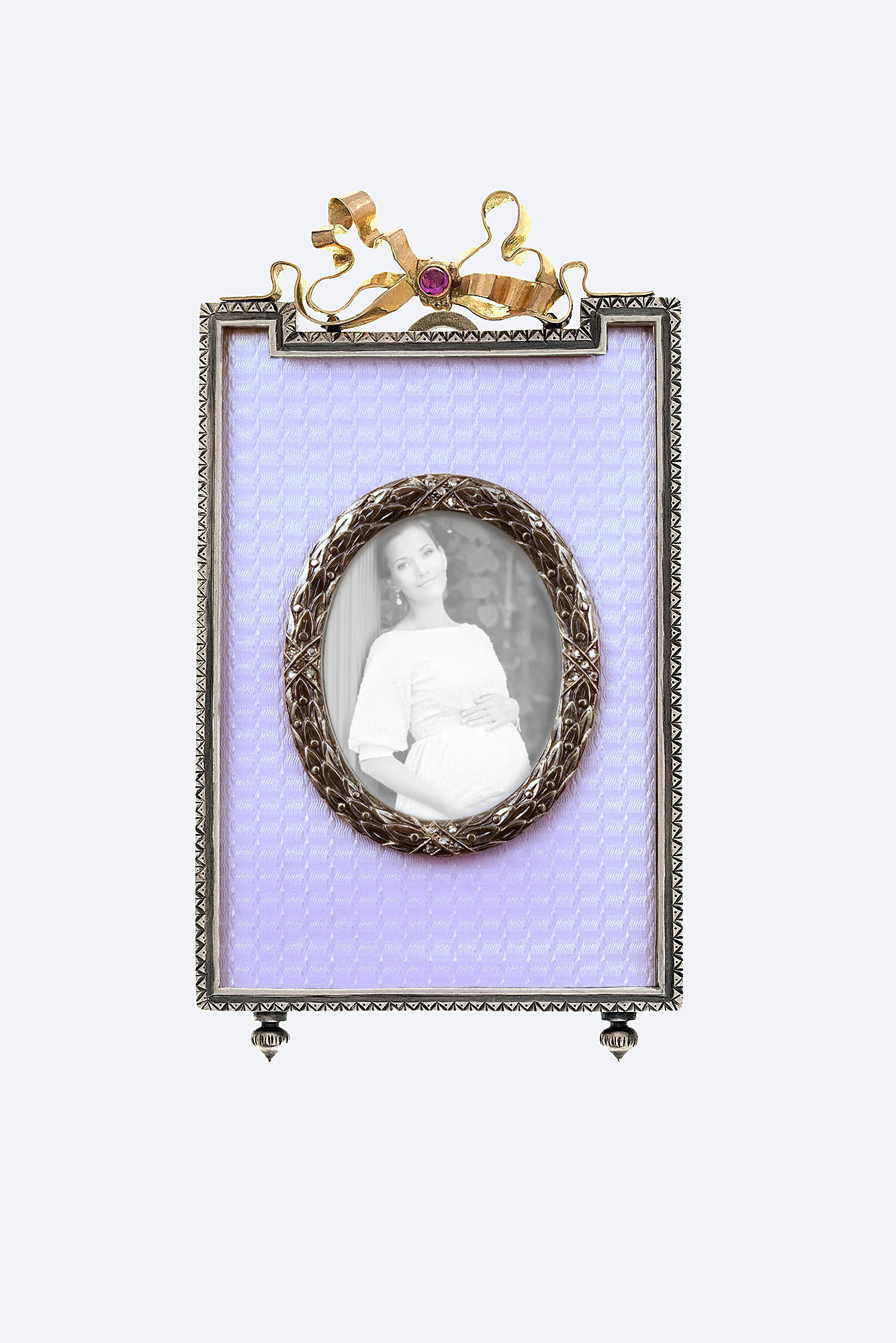 Золото, серебро, позолота, гранат, прозрачная эмаль по гильошированному фону (при изменении  света с дневного на электрический, меняется цвет эмали - с бледно сиреневого на розовый).