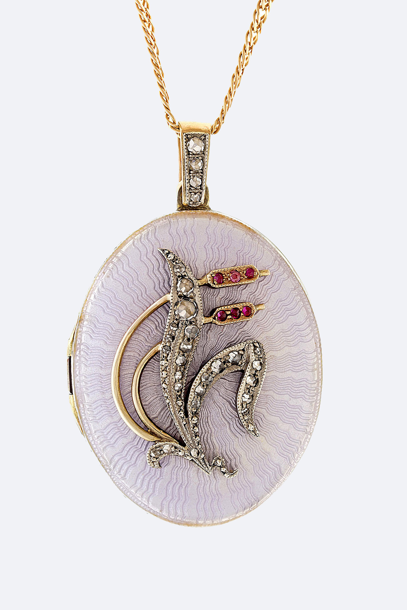 Золото 585, серебро 925, розы, гранаты, прозрачная эмаль по гильошированному фону